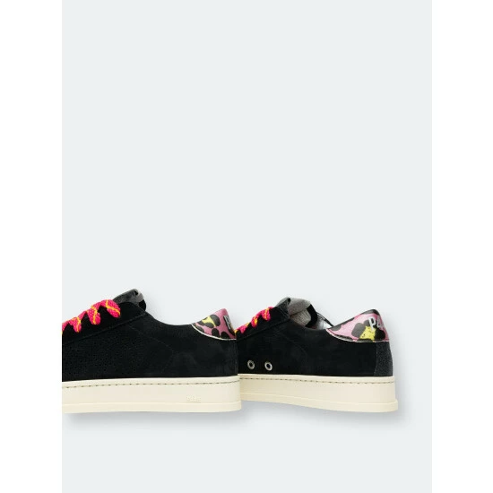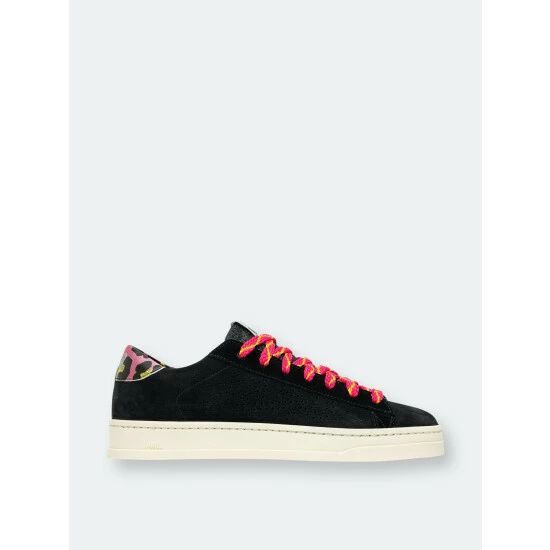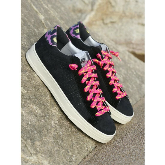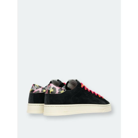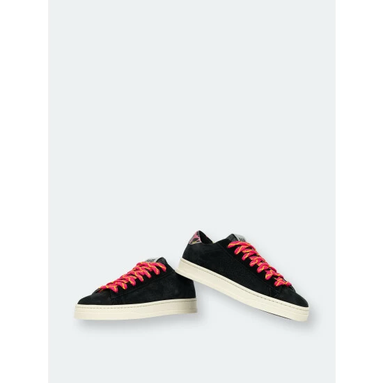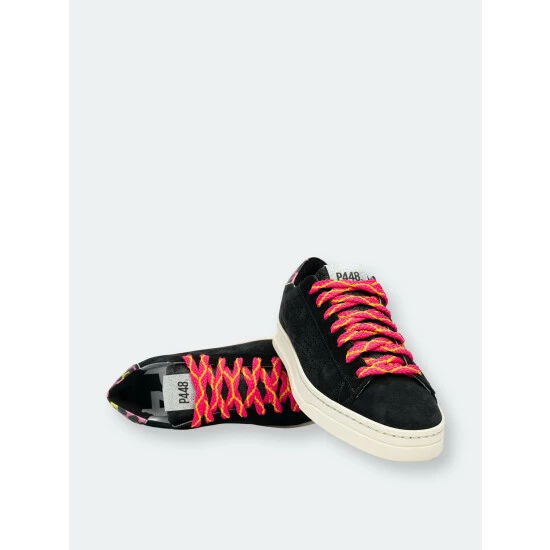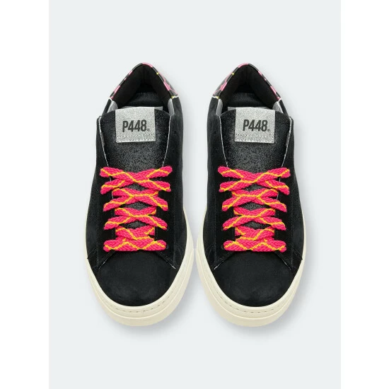 A sleek style similar to the iconic P448 John sneaker, but sporting a narrower toe. Bright pops of color on the heel tab and laces contrast the shadowy body.