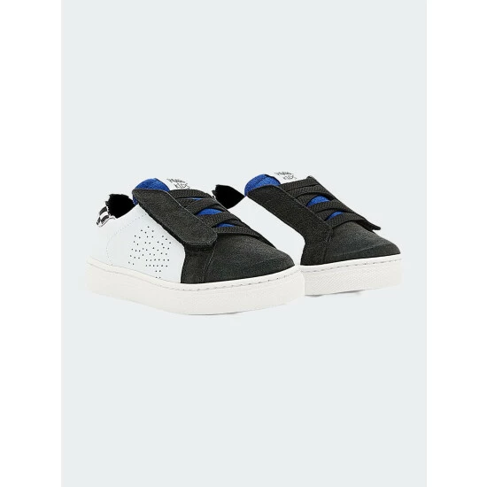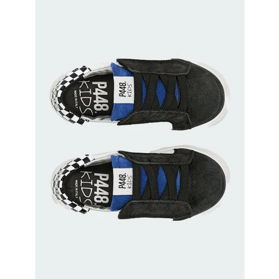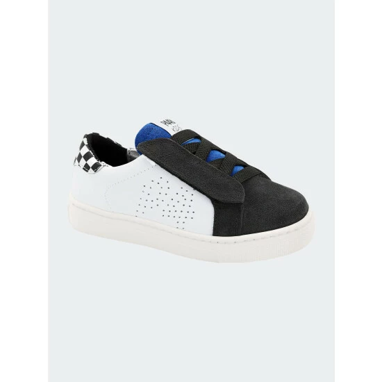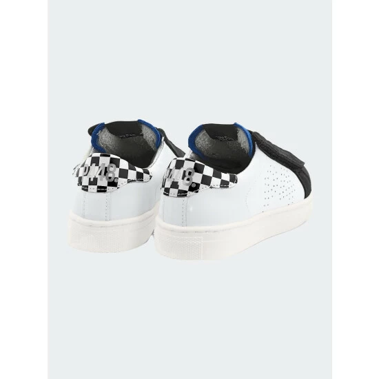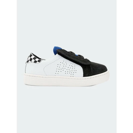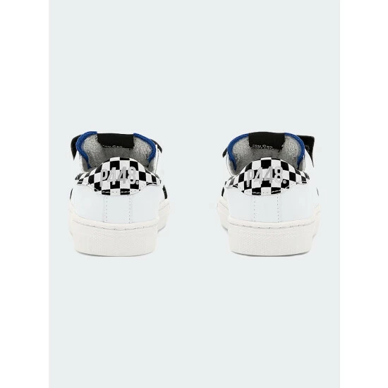 Meet the John Baby White/Chess a mini version of fan-favorite silhouette and pattern with a white leather upper, a royal blue suede tongue, Off-black toe, Black and white checkerboard heel tab, And finished with easy-on-easy-off black suede velcro closure and decorative black laces. Check mate.