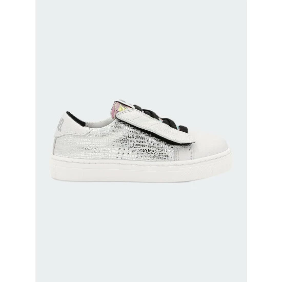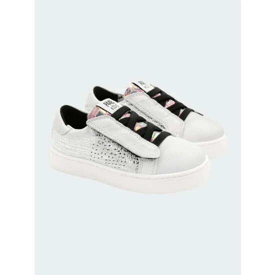 Meet the John Baby Sofa, a mini metallic style with a silver foiled upper, iridescent pink croco-embossed tongue, pearlized white toe & heel tab, and finished with easy-on-easy-off white pearlized velcro & decorative black laces. Talk about a silver lining.