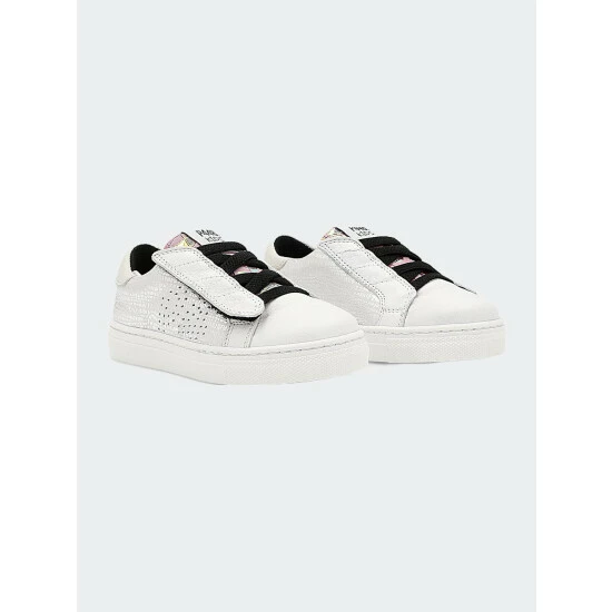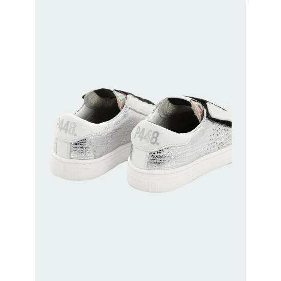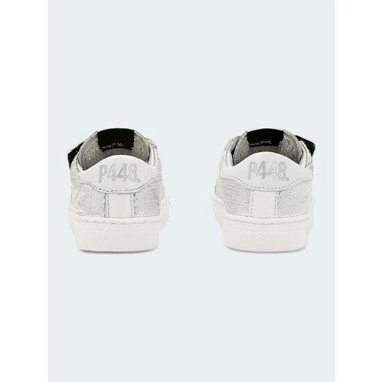 – White leather upper embossed with metallic silver foil & perforated P448 logo