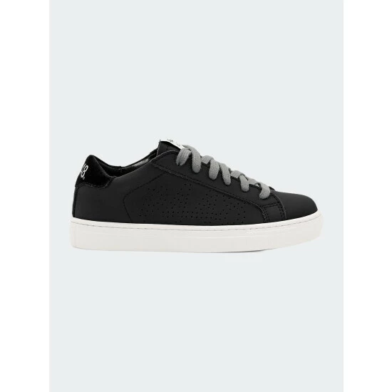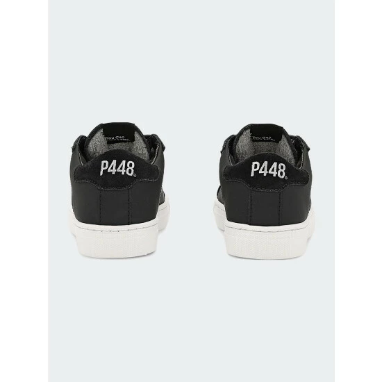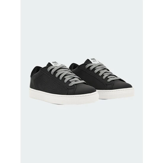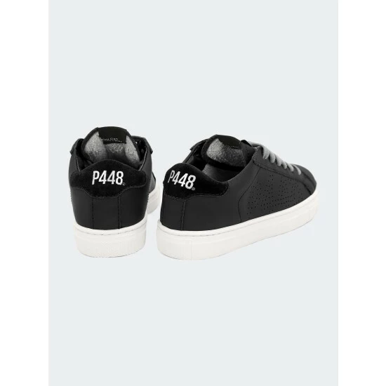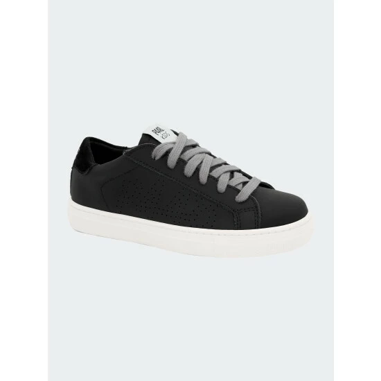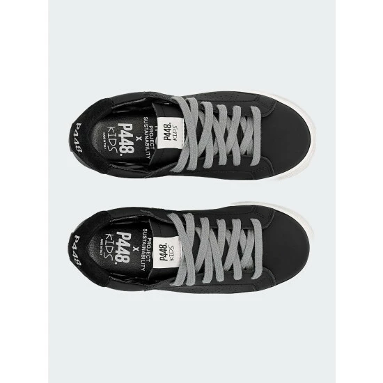 The John Jr. Recycled Black is a mini all-black version of the classic John silhouette featuring a black recycled leather upper, tongue, trim & toe, black recycled suede heel tab with white recycled leather accents, and black organic cotton laces.