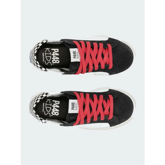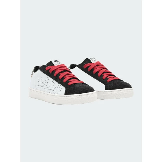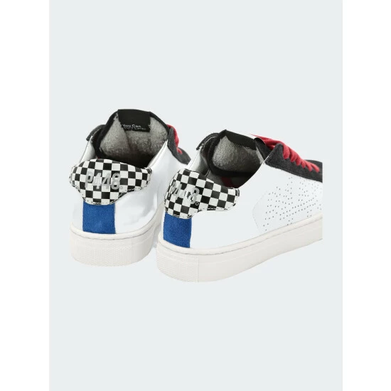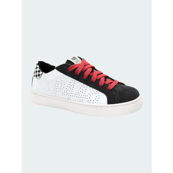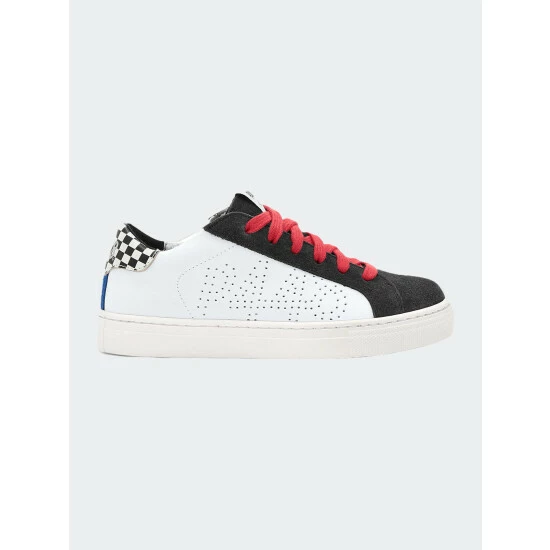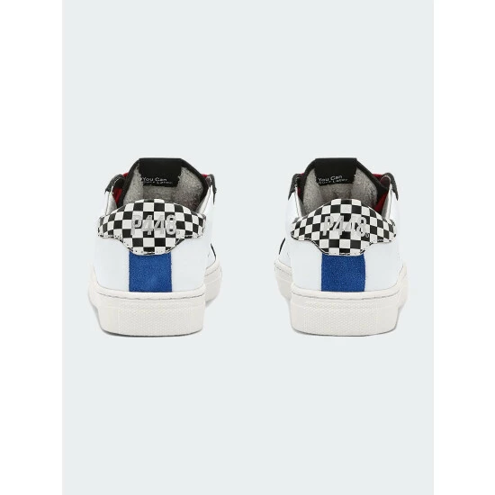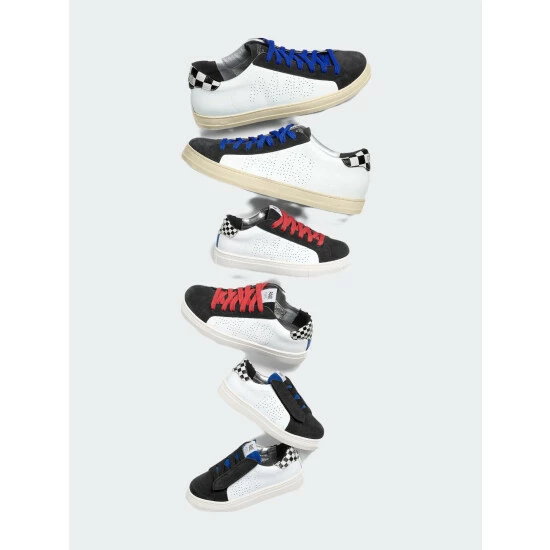 Meet the John Jr. White/Chess fan-favorite silhouette with a white leather upper, black suede tongue, trim, & toe, royal blue suede heel tab with black and white checkerboard details, and finished with red cotton laces. Check mate.