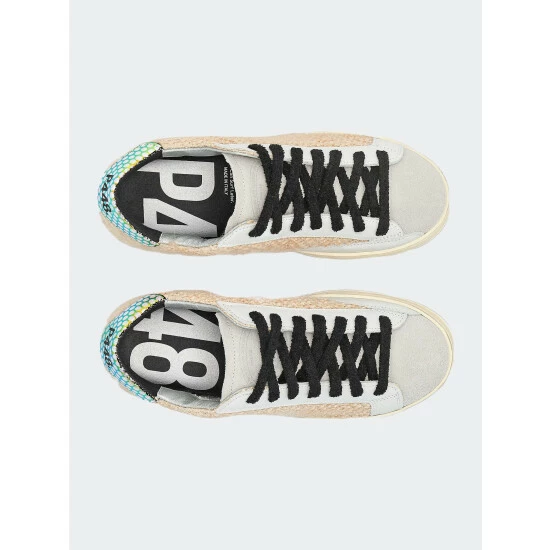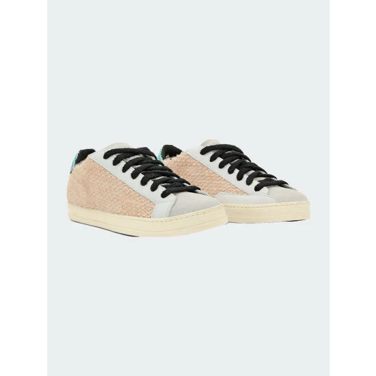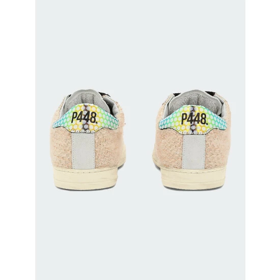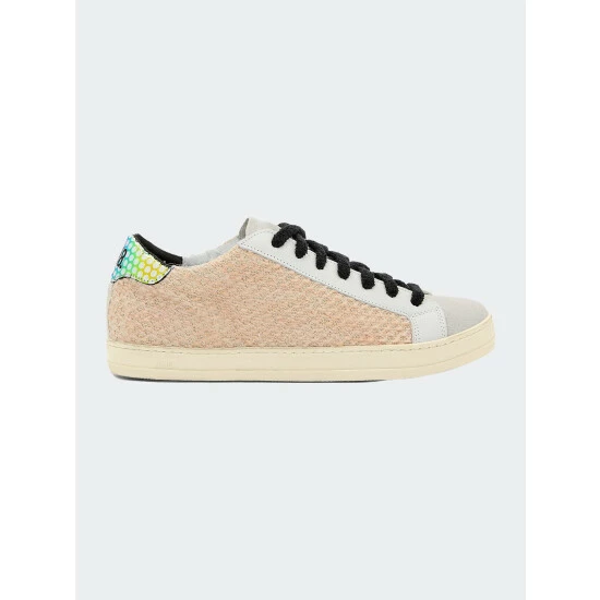 The John Wils is the best-selling low-top silhouette with a beige knitted upper with silver thread accents, an off-white suede tongue & toe, white leather trim and a holographic rainbow polka-dot printed leather heel tab. Finished with black terry cloth laces.