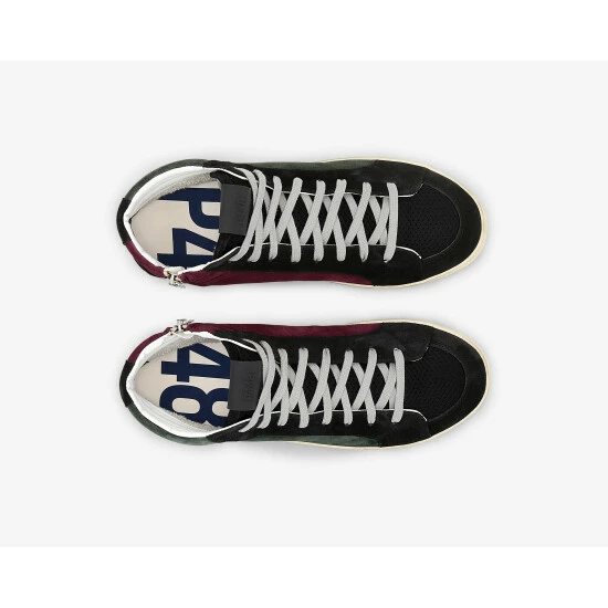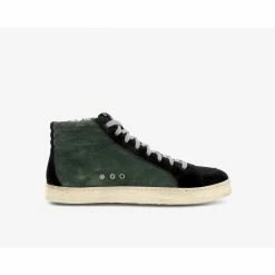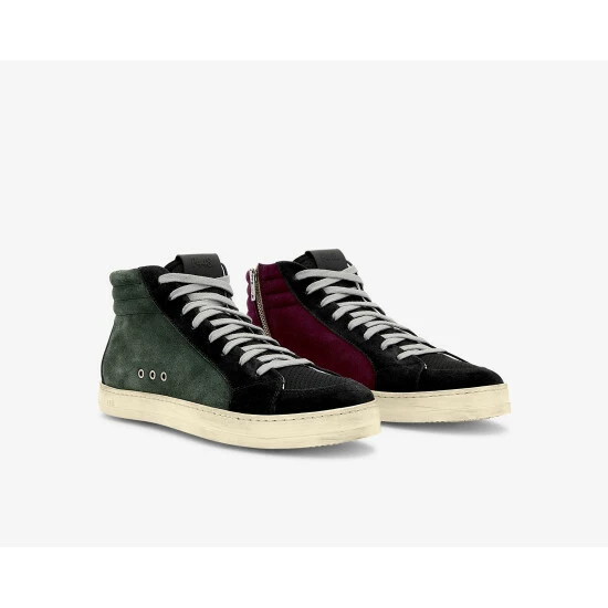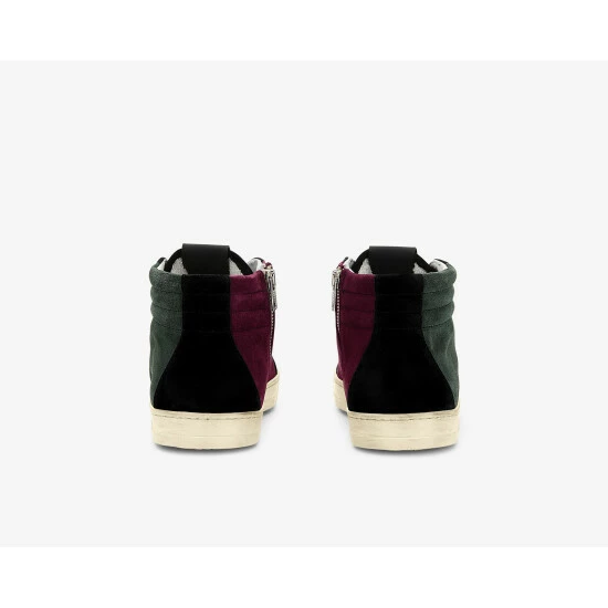 Meet The Skate Recycled Suede Forest – skate culture-inspired high-top silhouette featuring a recycled forest green suede on the exterior upper, complemented by a bordeaux colored recycled suede on the interior upper, with a black recycled nylon mesh tongue and toe, recycled black suede trim & heel tab, recycled grey organic cotton laces and a recycled tread.