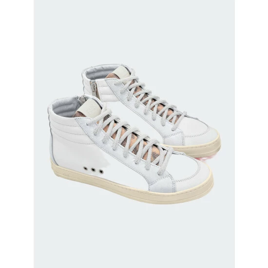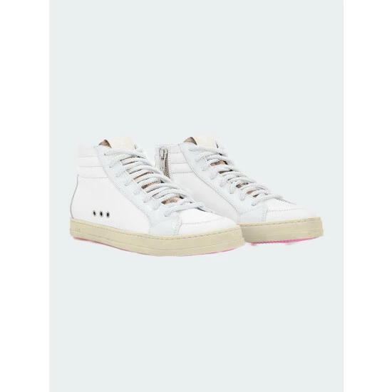 Take a walk on the wild side with the Skate Sneaker Tanky. The skate culture-inspired high-top silhouette with a white leather upper and toe, white crackled leather heel tab and trim, a leopard printed suede tongue, white braided laces and fluorescent pink tread.
