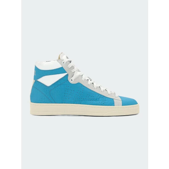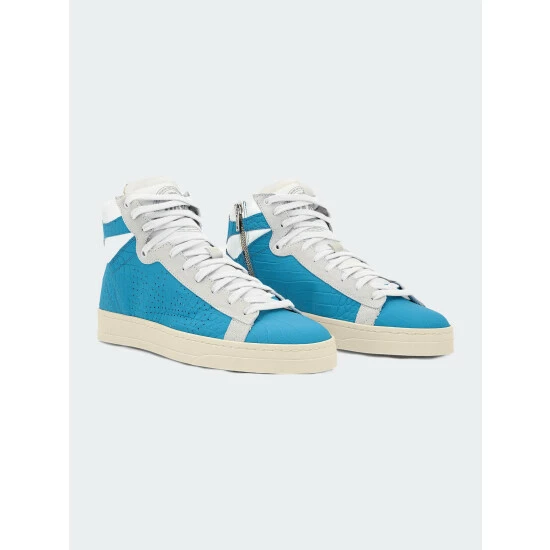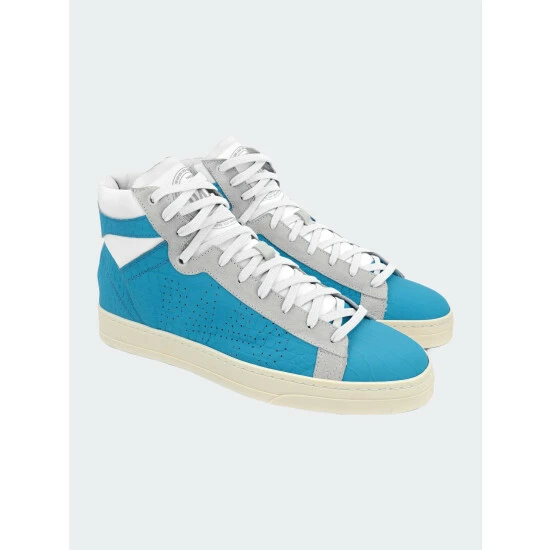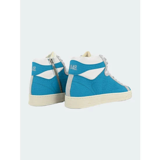 Meet the Taylor Blues, featuring an aqua blue croco-embossed upper and toe, white nylon tongue, off-white suede trim, and a white nylon textile heel tab and ankle shaft with aqua croc-embossed leather accents. Finished with aqua blue cotton laces. This style is exclusively available on P448.com & P448 retail locations.