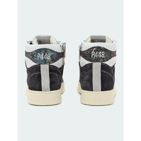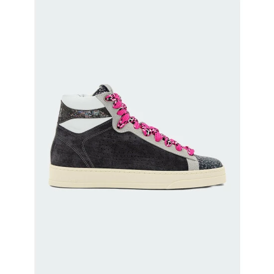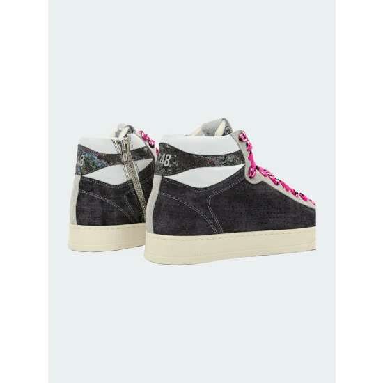 The Taylor Denim is a retro high-top style with a denim-blue suede upper, a multi-blue print tongue & toe, grey suede trim, a white calf ankle, a blue suede heel tab with iridescent foil detail and striking fuchsia, white and black laces.