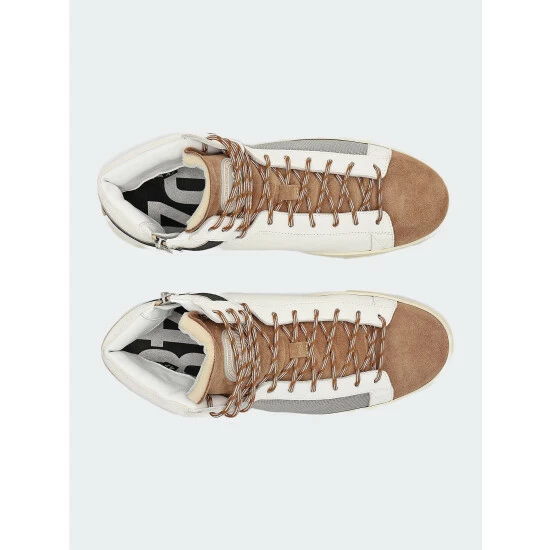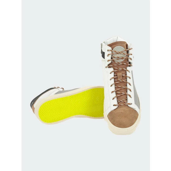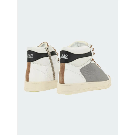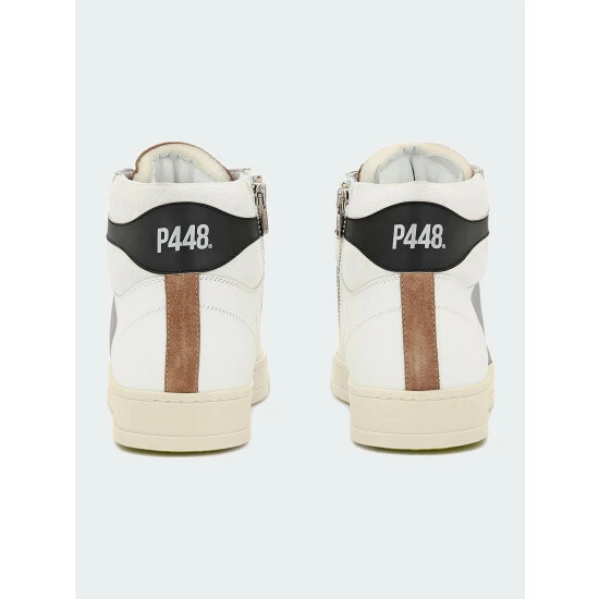 The Taylor Peaky is a fan-favorite high-top style in a neutral colorway with a white leather upper, grey canvas accents, white leather trim, an off-white suede ankle shaft, a black leather heel tab, and a tobacco suede toe and tongue with a silicone P448 logo. Finished with tobacco and white tubular laces for a fresh take on retro-inspired kicks.
