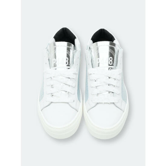 – Silver metallic leather tongue