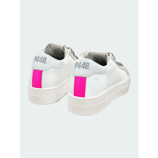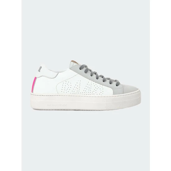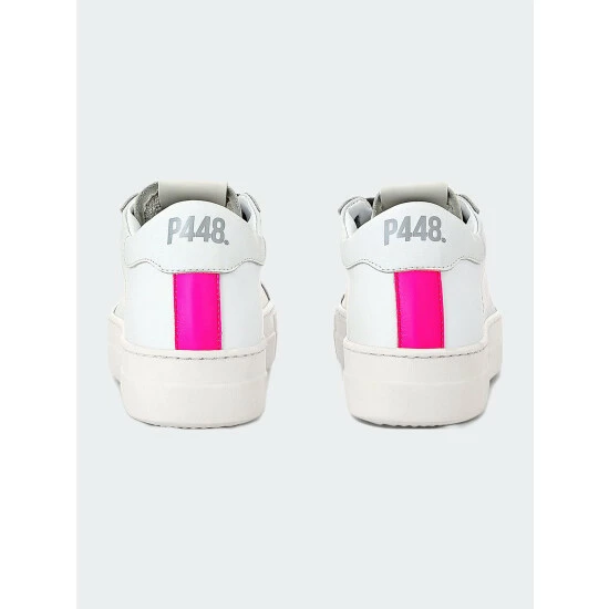 Well-loved platform style, but make it earth-friendly. The Thea Recycled White/Fuchsia features a white recycled leather upper, a light grey recycled leather toe & trim, a fluorescent fuchsia recycled leather heel tab and recycled grey organic cotton laces.